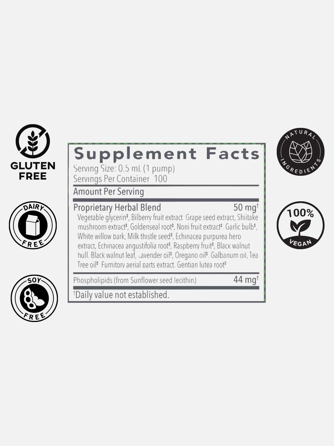 | Proprietary Herbal Blend: Bilberry extract (25% anthocyanosides), Noni, Milk Thistle, Echinacea (purpurea & angustifolia), Goldenseal, Shiitake, White Willow (bark), Garlic, Grapeseed extract (min 90% polyphenols), Black Walnut (hull and leaf), Raspberry, Fumitory, Gentian, Tea Tree oil, Galbanum oil, Lavender oil (plant and flower), Oregano oil (plant and flower). | ** | ||