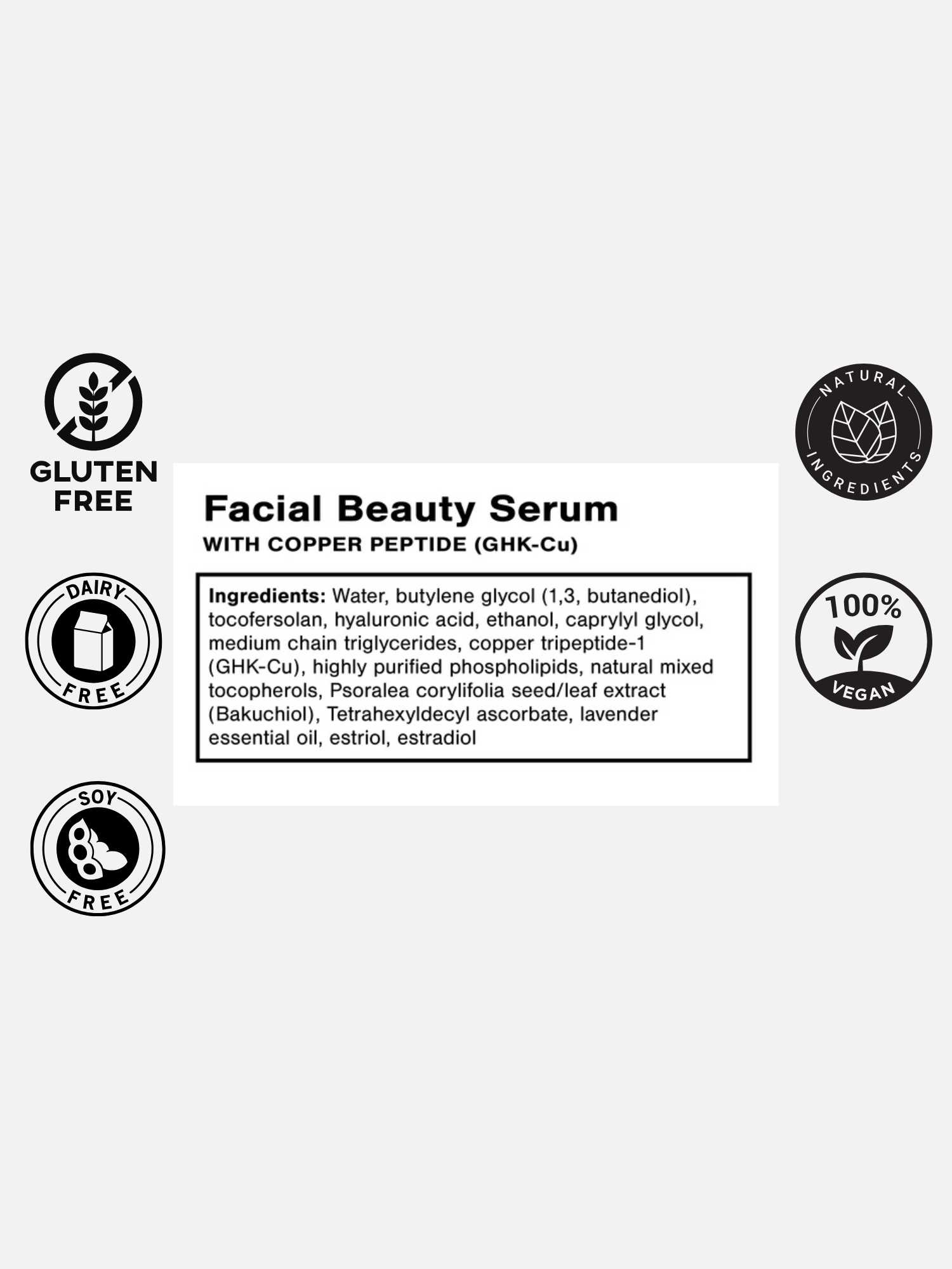 Facial Beauty Serum is an advanced formula designed to support skin health. The serum contains estriol, copper peptides, and hyaluronic acid. It is formulated for women in the perimenopausal and menopausal stages of life to support a more youthful appearance.