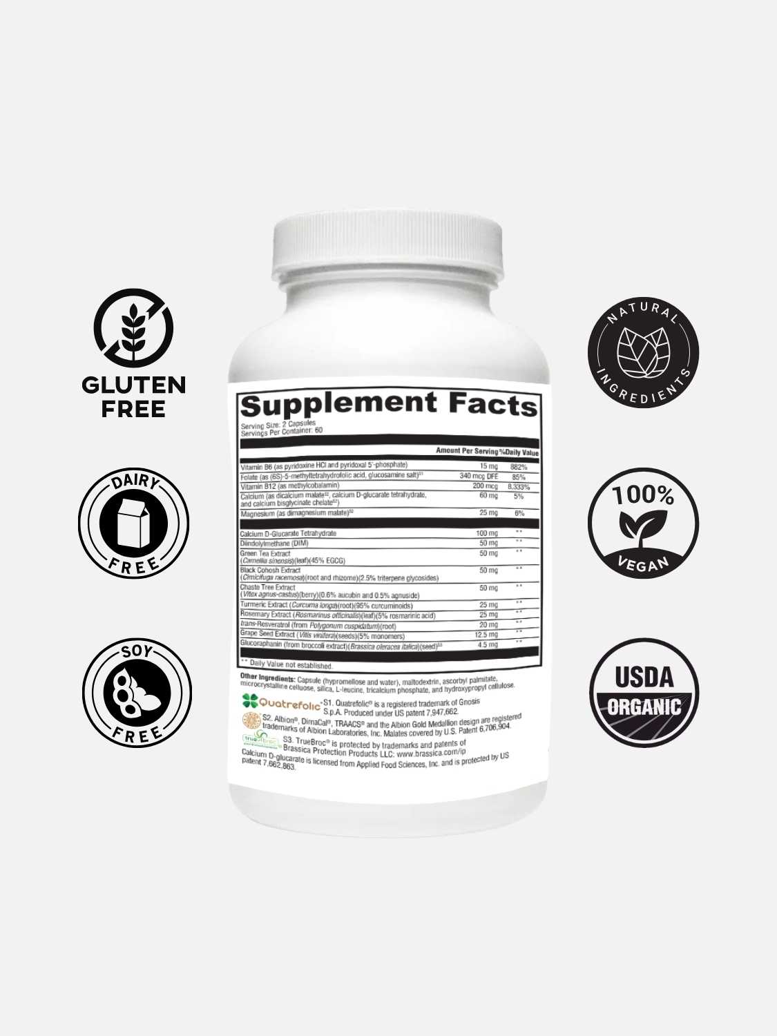 | Calcium (as DimaCal® dicalcium malate, calcium D-glucarate, and TRAACS® calcium bisglycinate chelate) | 60 mg | 5% |