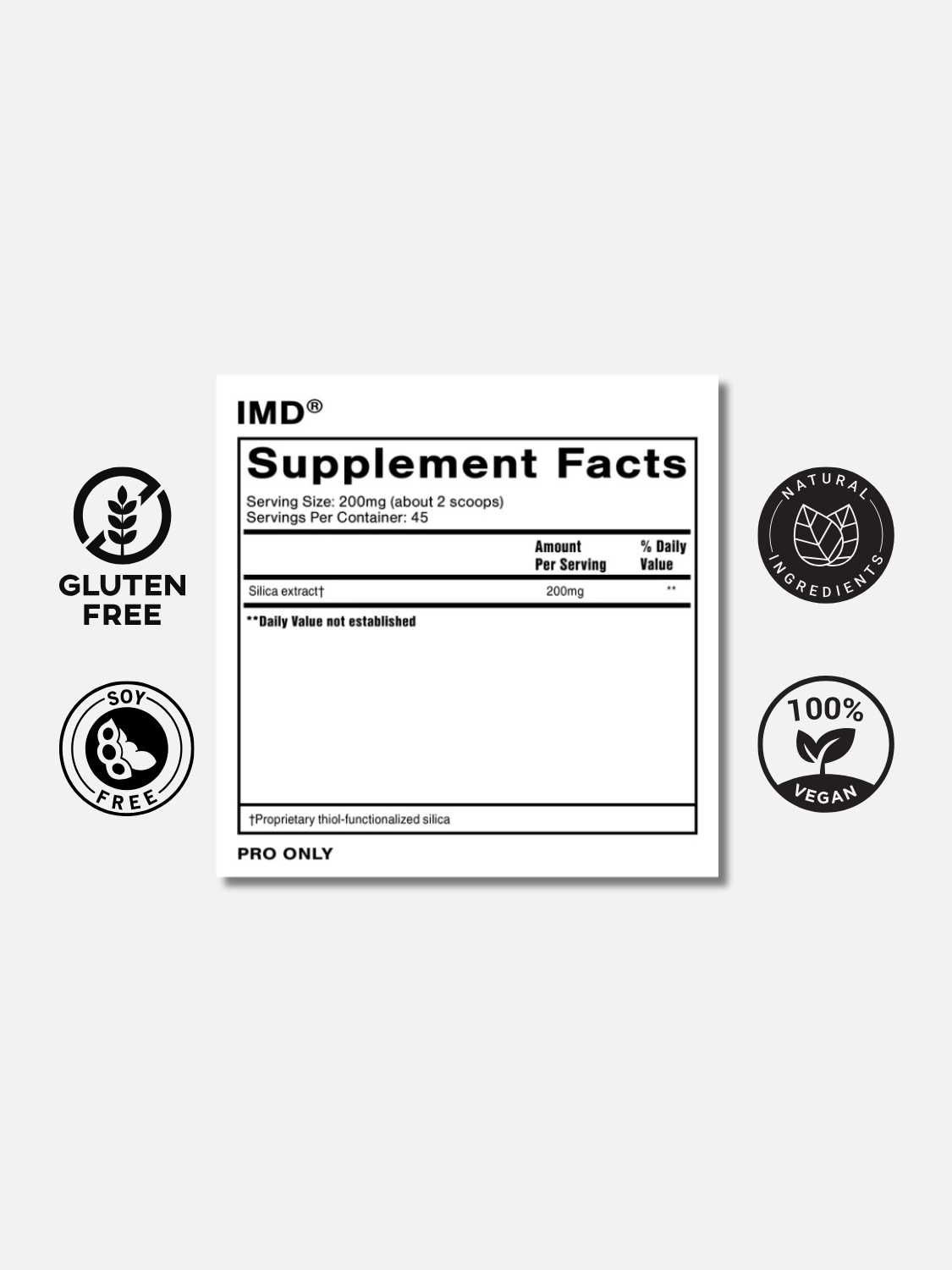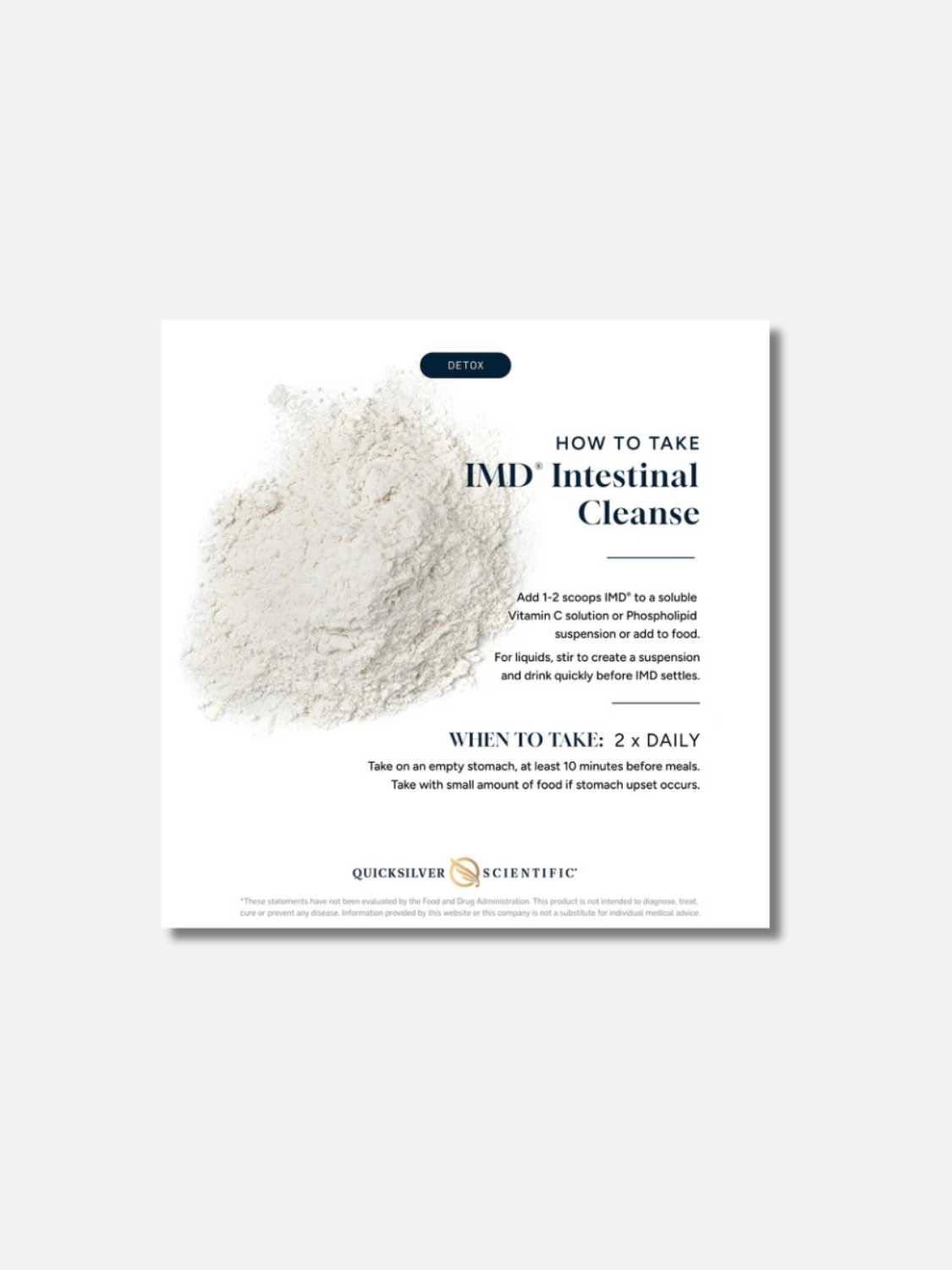 IMD® (Intestinal Metals Detox) Intestinal Cleanse is a product formulated to support detoxification. It contains a proprietary, highly purified silica with covalently bound thiolic groups. This product is designed to bind to certain metals, which are then carried out of the body through the intestines.