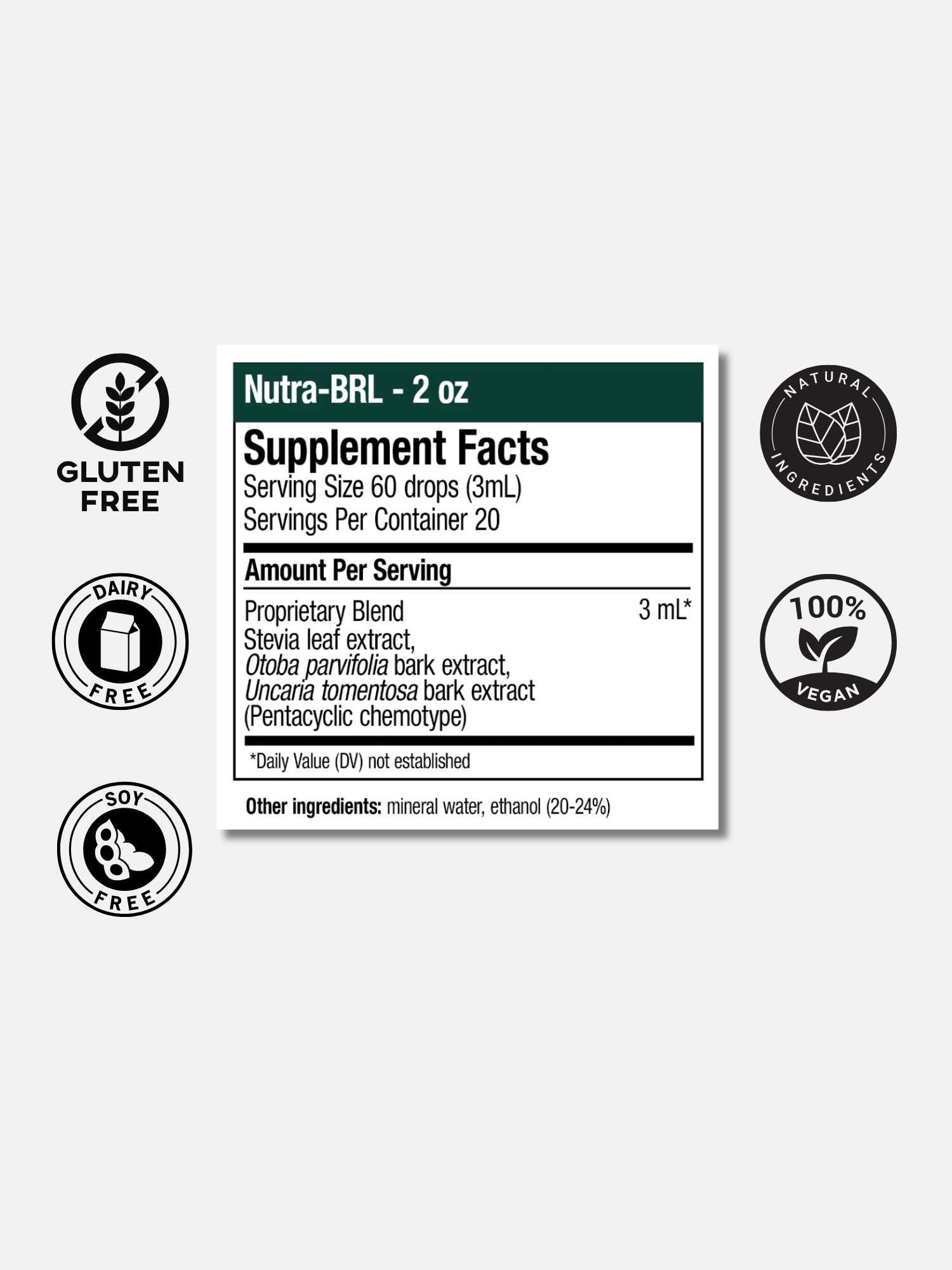 Nutra-BRL™ is a comprehensive formula with a synergistic blend of Samento (Uncaria tomentosa) bark, Stevia (Stevia rebaudiana) leaf, and Banderilla (Otoba parvifolia) bark. It is designed to assist with microbial support, immune function, and a healthy inflammatory response.