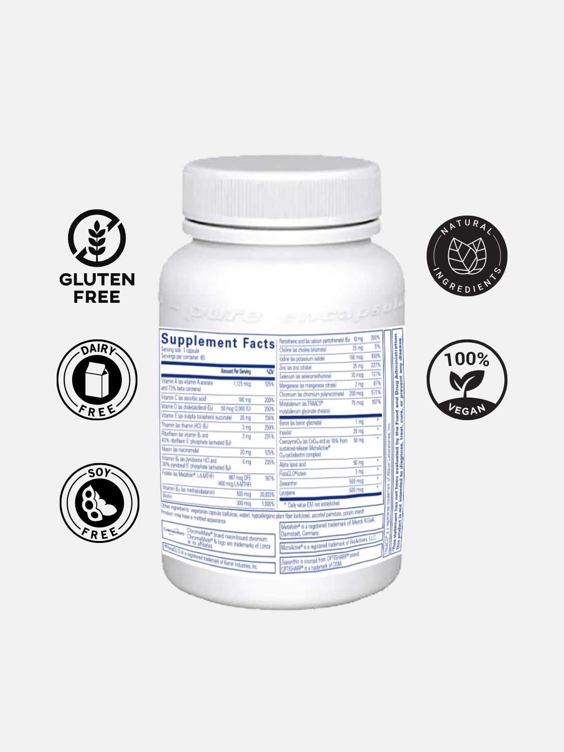 O.N.E.™ Multivitamin provides a comprehensive profile of highly bioavailable vitamins, fully chelated minerals, and antioxidants to support optimal health. This formula includes Metafolin® L-5-methyltetrahydrofolate (L-5-MTHF), the naturally occurring form of folate, and lutein and zeaxanthin to help maintain retinal health. Antioxidants include lycopene, alpha lipoic acid, and coenzyme Q10, provided as a blend of standard ubiquinone and a sustained-release form (MicroActive® Q10). This formula also provides choline and inositol, which play essential roles in neuronal function, and vitamin D to support cellular health.