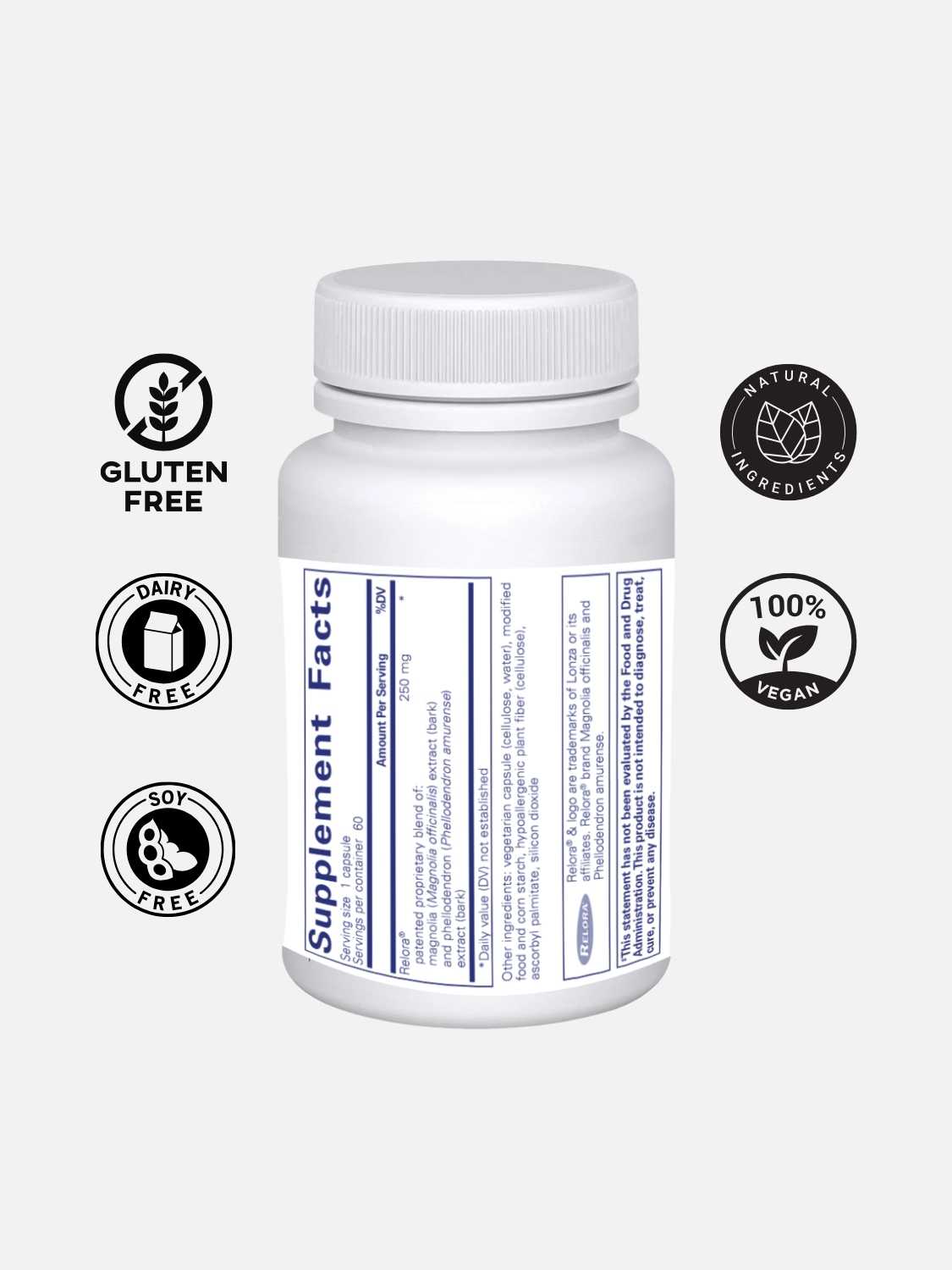 Relora® is a proprietary blend of Magnolia officinalis and Phellodendron amurense. This combination of extracts is designed to promote a positive mood and mediate everyday stress-related emotions, eating behavior, and muscle tension. The magnolia and phellodendron fractions may bind to central nervous system receptors, which encourages feelings of satiety and relaxation. The product is also designed to help with stress-related eating behavior and to support mood and relaxation. It is made with hypoallergenic, vegan ingredients.