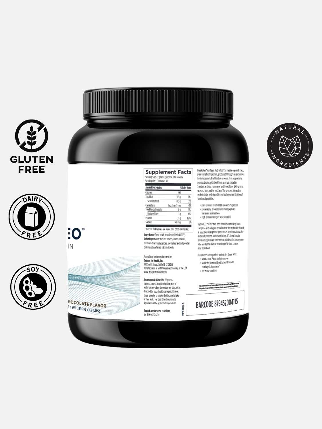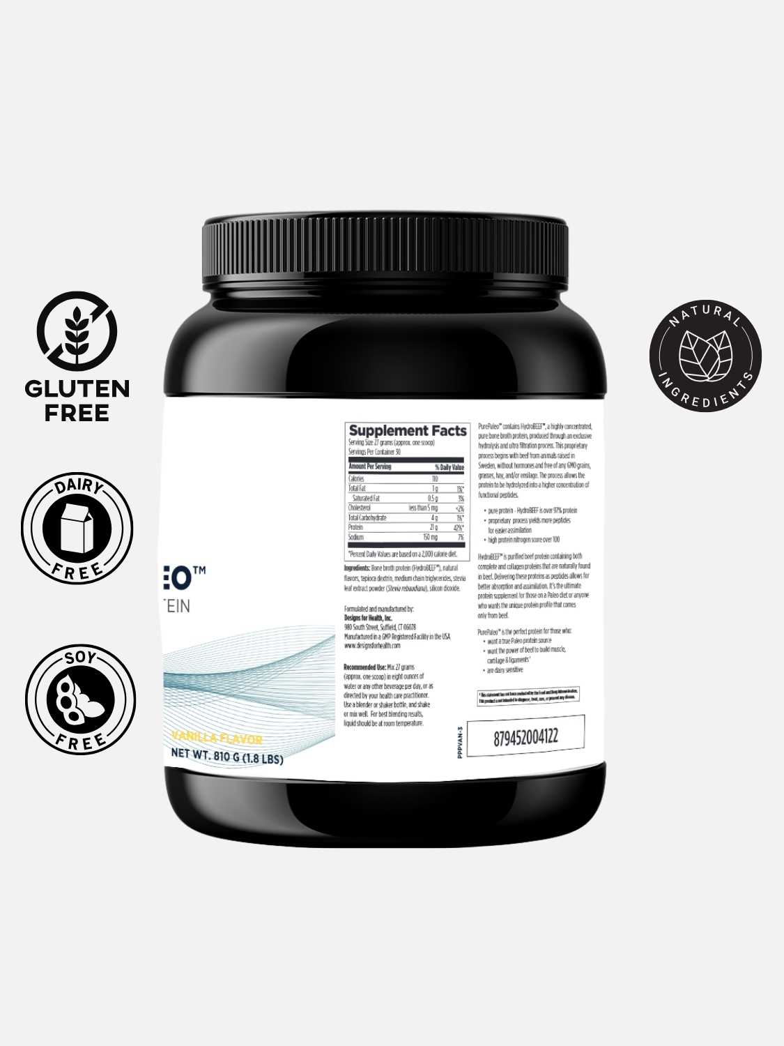 PurePaleo© is a great-tasting, dairy-free protein powder, yielding 26 g of protein per serving. It contains HydroBEEF©, a highly concentrated, pure beef protein, produced through a proprietary process that allows the protein to be hydrolyzed into peptides for easier absorption. The beef is from animals raised in Sweden without hormones or antibiotics, and the product is free of any GMO grains, grasses, and/or ensilage.