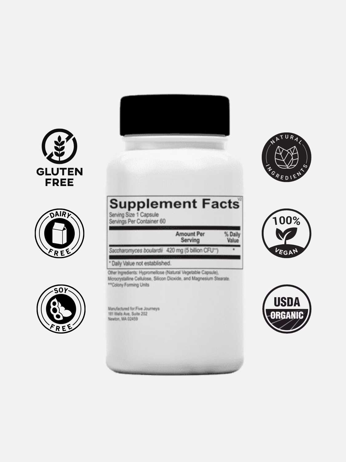 This product contains a formulation of Saccharomyces boulardii, a probiotic yeast. Each capsule includes 5 billion colony-forming units. The formula is freeze-dried, lactose-free, and strain-verified through genetic typing.