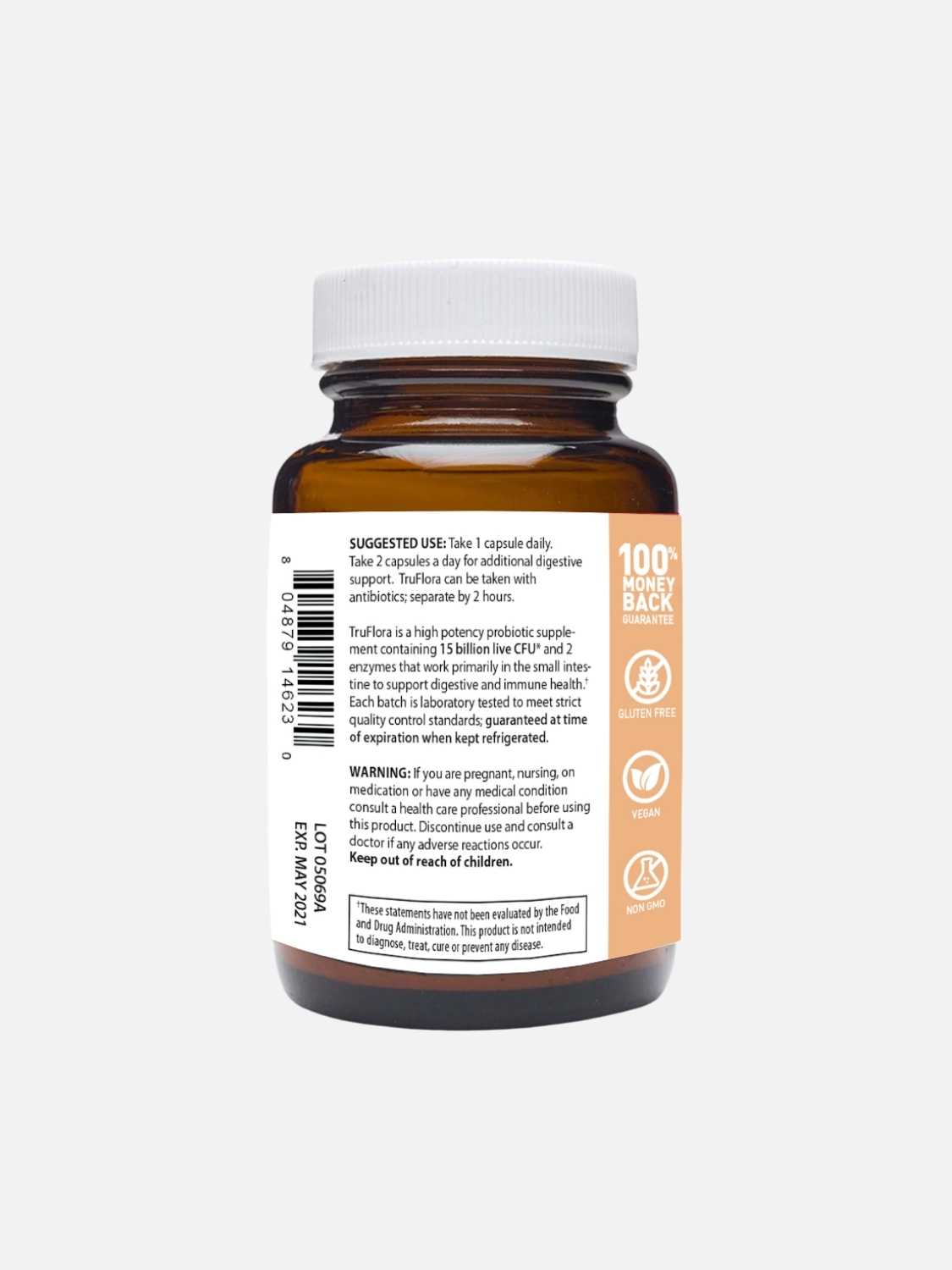 TruFlora® is a combination of probiotics and enzymes created to support a healthy gastrointestinal tract. The product pairs 15 billion CFU of Lactobacillus and Bacillus probiotic bacteria with 2 digestive enzymes. The probiotics and enzymes are designed to work together to support a healthy digestive tract, leaving you with increased energy.